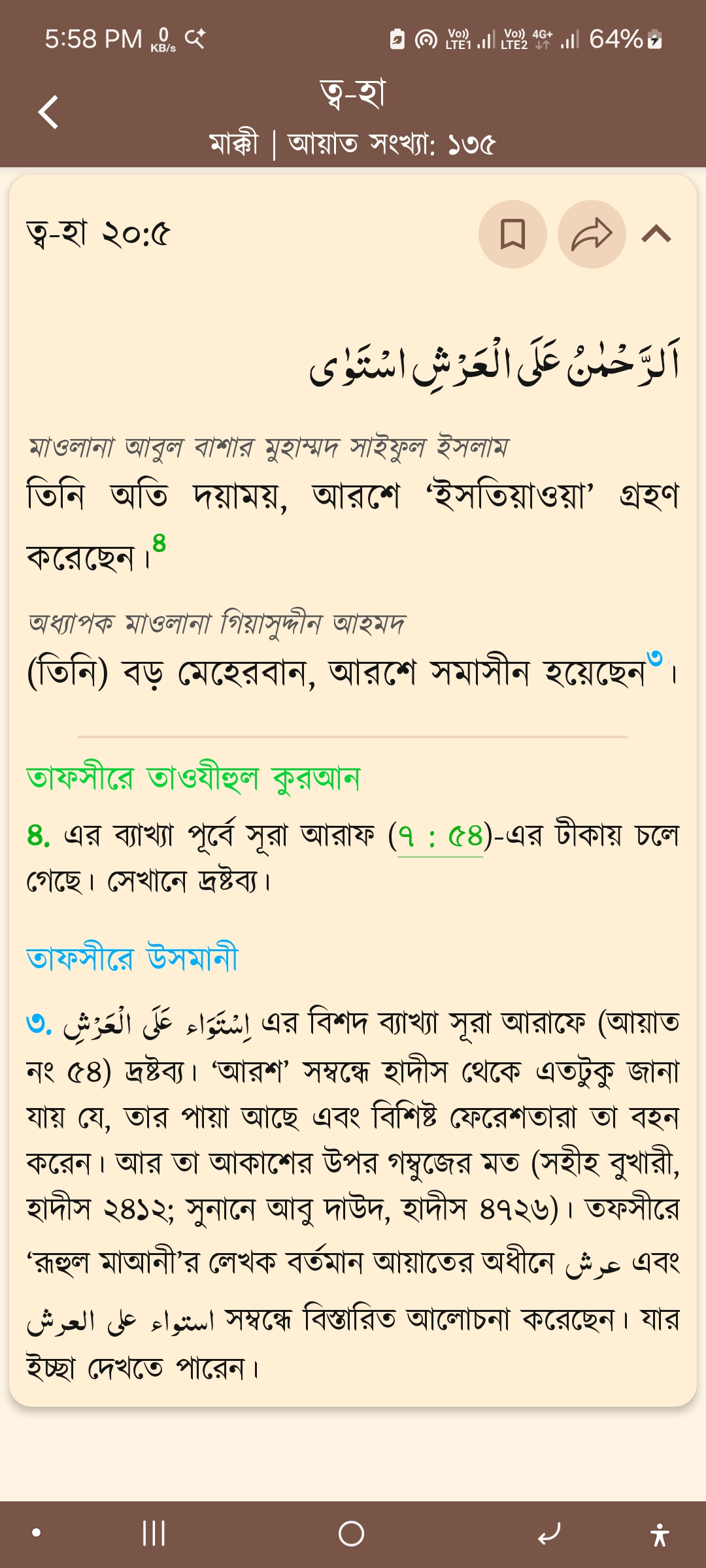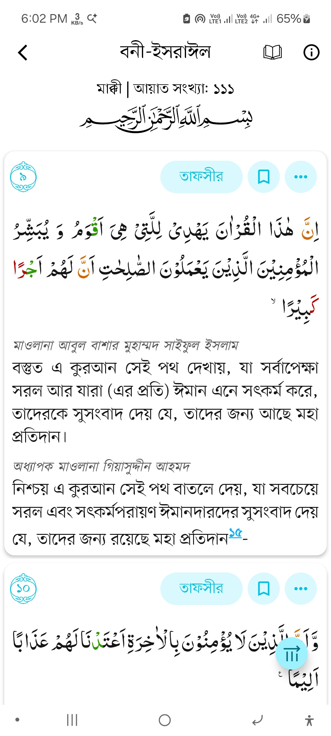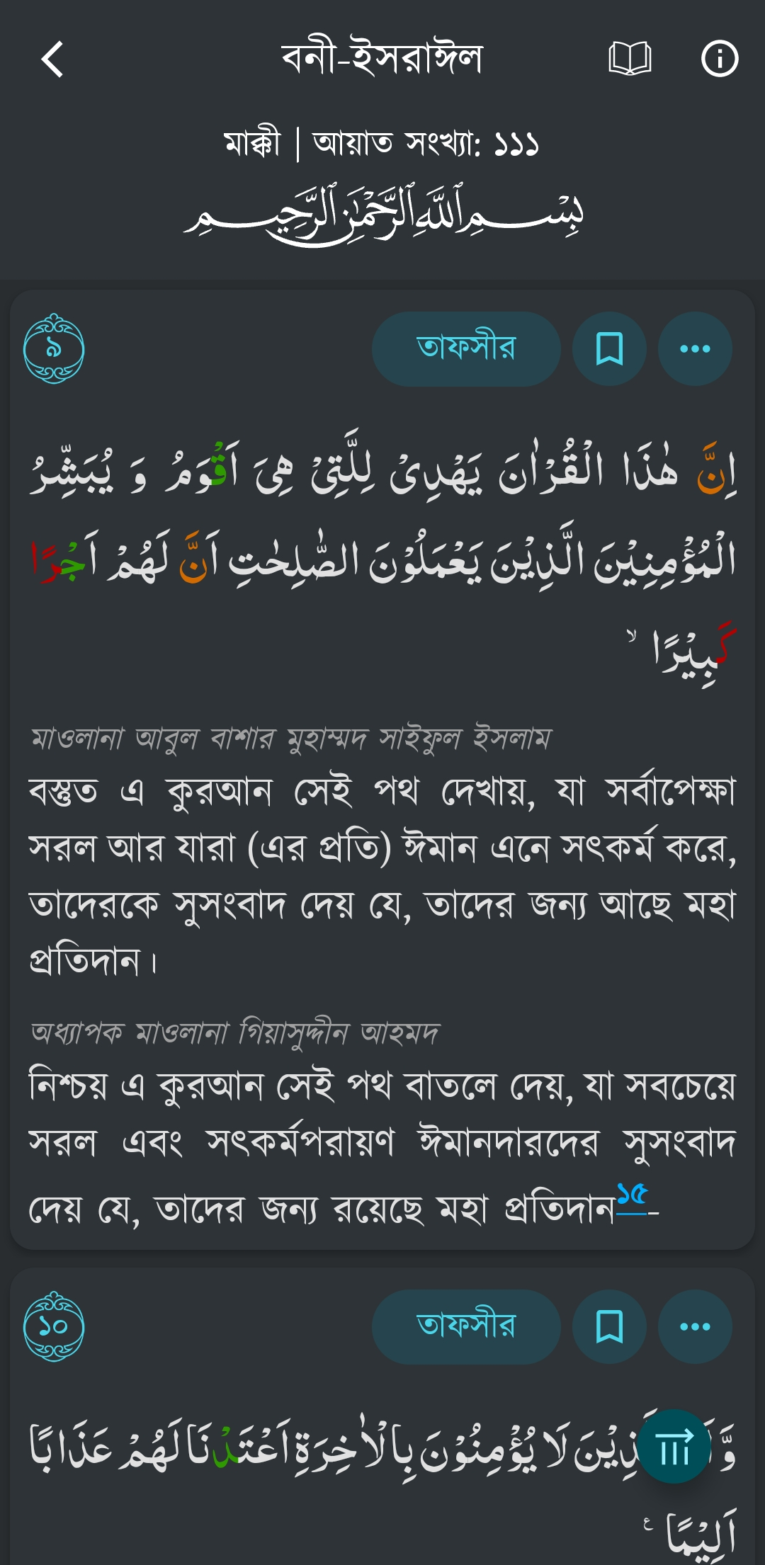 "This is one of the best islamic apps for tafseer. It's so beautifully organised with important duas and ayahs. Highly appreciate their effort. May Allah bless the organisers with barakah in this dunya and akhirah. Very much promising app. With its rich resources it's going to be one of the best Islamic apps for Bengali readers. A Good apps for reading 2 tafsir at a time, also you can read daily life duas from the books they added in their apps."